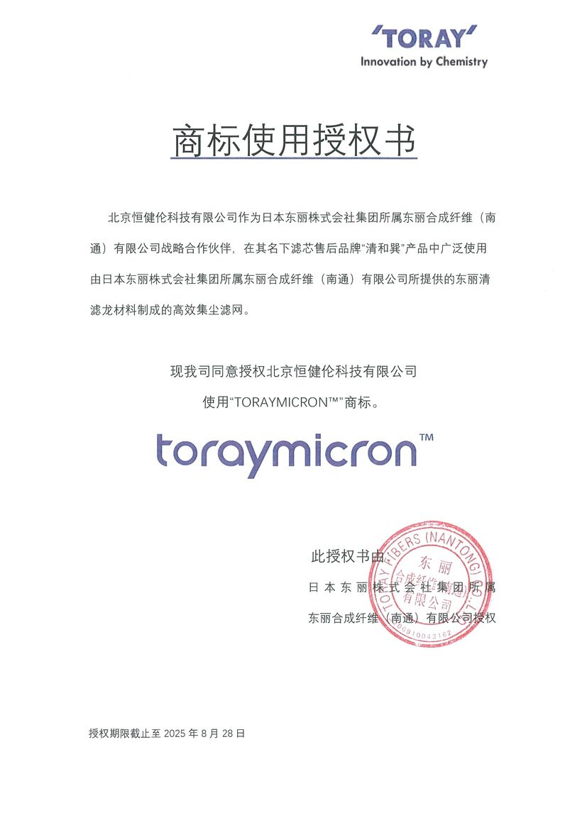 2024年8月28日,日本东丽株式会社集团授权战略合作伙伴北京恒健伦科技有限公司空气过滤器产品使用东丽“TORAYMICRONTM”商标,这标志着北京恒健伦与日本东丽在空气滤材上的深度合作。